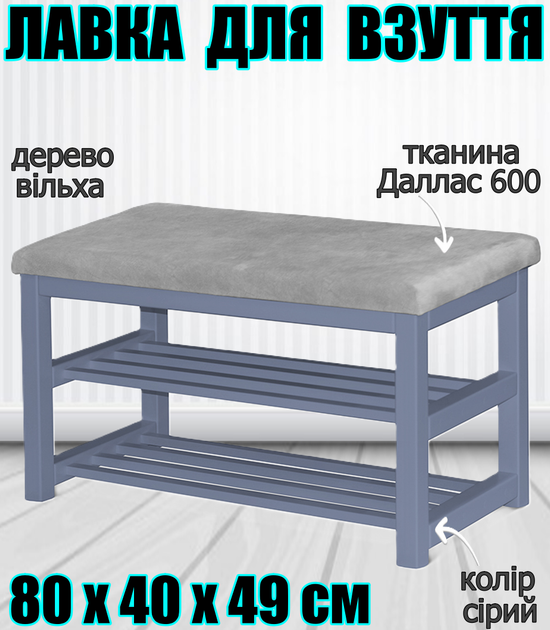 Банкетка підставка для взуття 80х40х49 см м'яка лавка для взуття з 2 поліцями, пуфік каркас із дерева Сірий Вільха Даллас 60