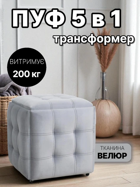 Пуф 5 в 1 трансформер сірий велюровий квадратний розкладний смарт пуфик 5в1 м’який велюр на п’ять стільців пуфики трансформе