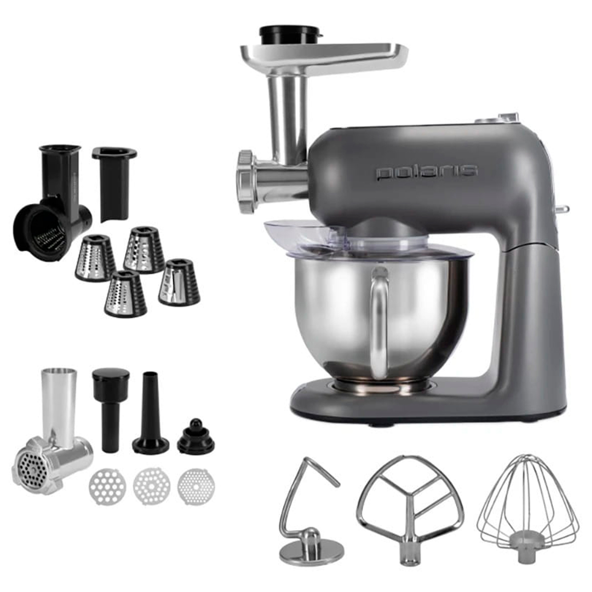 ть Кухонна машина Polaris PKM 2204L Graphite — це справжній багатофункціональний центр для приготування їжі. Потужність у 2300 Вт забезпечує швидке та ефективне виконання будь-яких кулінарних завдань. У комплект входять м’ясорубка з трьома ґратами, насадки для ковбас і кебабів, терки та слайсер, а також вінчик, гак для тіста й насадка для