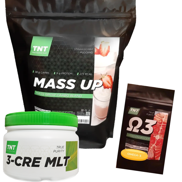 Гейнер Mass up TNT Nutrition 2,5 кг / Полуничний пудинг + Креатин малат 0,3 кг / банка + Кардіопротектор Омега 3