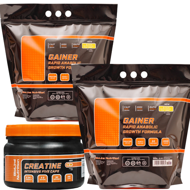 Gainer вуглеводно-білковий 6 кг набір загальної та м'язової маси + ріст м'язів + Креатин 5 в 1 150 капсул