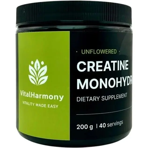 VitalHarmony Creatine Monohydrate – харчова добавка з 100% чистим мікронезованим креатином моногідратом для підтримки сили, витривалості, зростання м'язової маси та прискореного відновлення. Переваги VitalHarmony Creatine Monohydrate: - Збільшує силу та потужність при коротких інтенсивних навантаженнях. - Підвищує витривалість та загальну працездатність. - Зменшує час відновлення між
