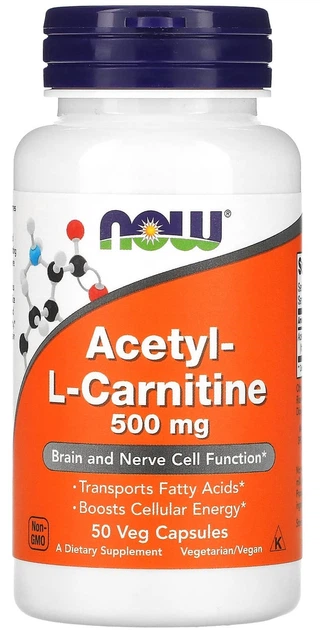 Амінокислота ацетил- L-карнітин, 500 мг, 50 вегетаріанських капсул, бере участь у процесі спалювання жиру, NOW Foods.