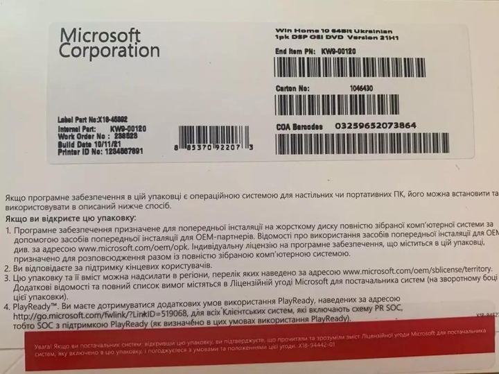 Windows 10 Домашня 64-bit OEM DVD версія для збирачів 1ПК українська мова (KW9-00120)