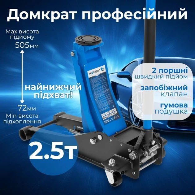 Домкрат гідравлічний підкатний 2.5т Hogert 72-505мм професійний для автомобіля (HT8G060)