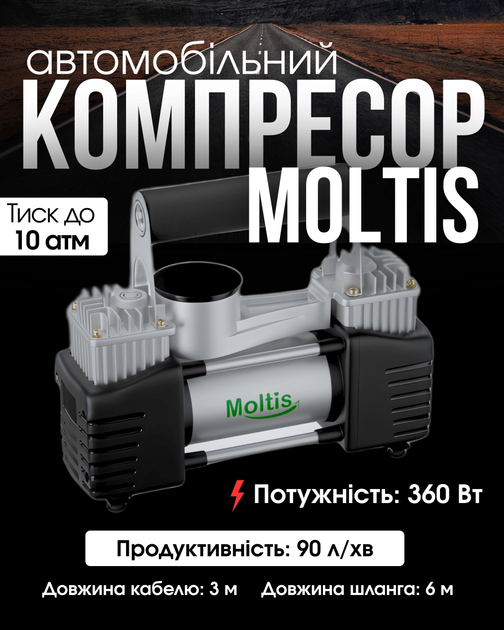 Автомобільний компресор Moltis 10868, 2-поршневий, 90 л/хв, 12В, метал, шланг 5.7 м, сумка