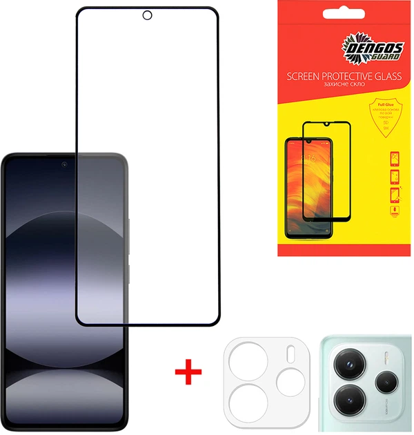 Комплект захисне скло для екрана + захисне скло камери DENGOS Full Glue для Xiaomi Redmi Note 14 4G/5G Black (DG-TGSCP-08)