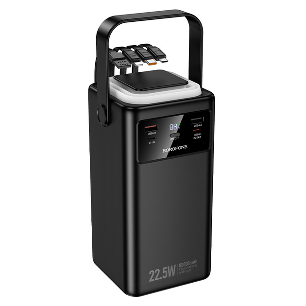 Павербанк 80000мА·г з швидкою зарядкою 22.5Вт, вбудованими кабелями та ліхтарем BOROFONE BJ65B Чорний