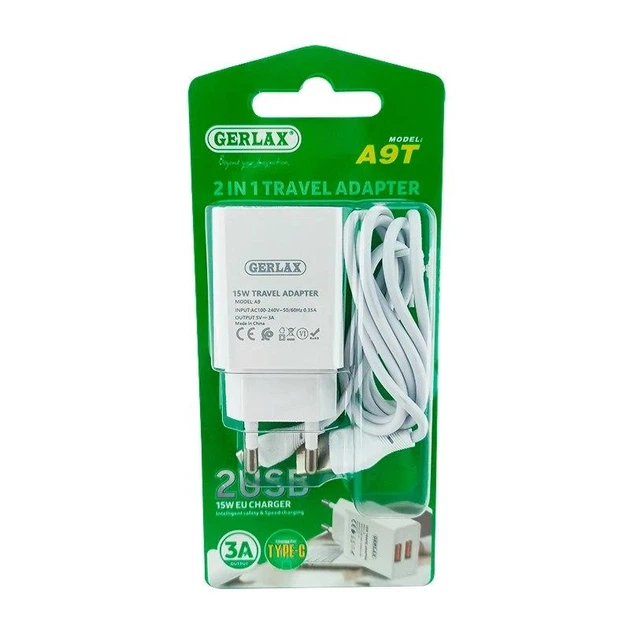 Зарядний пристрій для телефона 3A/15W/ 2 USB з кабелем Type-C арт. A9T, 12602 Gerlax