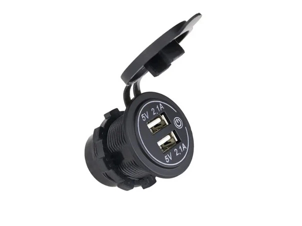 Гніздо під 2 USB DC 12-24V/5V 2,1-1A, синій індикатор з різьбленням