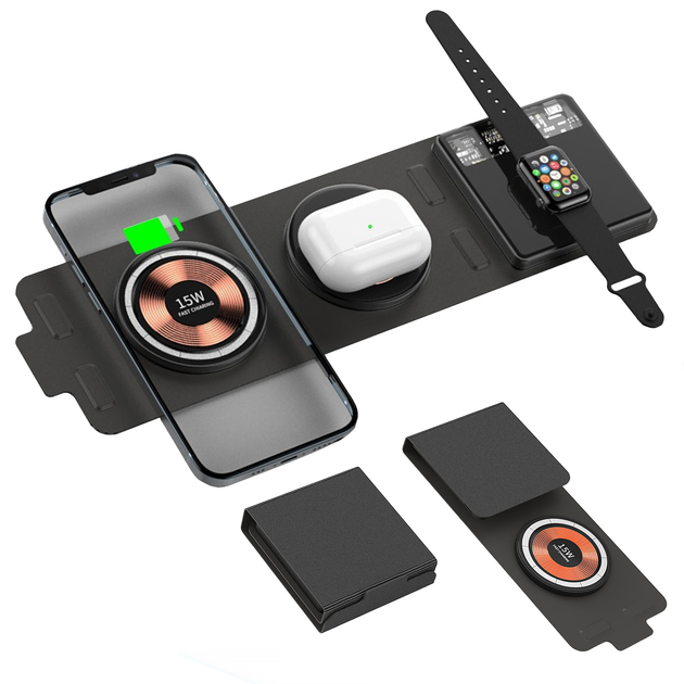 Бездротова зарядка 3 в 1 з потужністю 15 Вт для телефону, годинника та навушників.