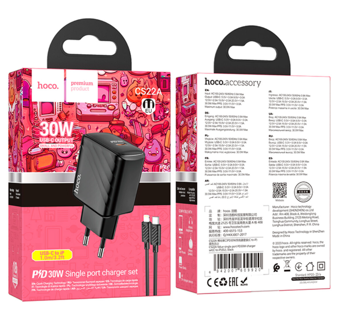 Мережевий зарядний пристрій з кабелем HOCO CS22A Value single port PD30W charger set(C to iP) Black new