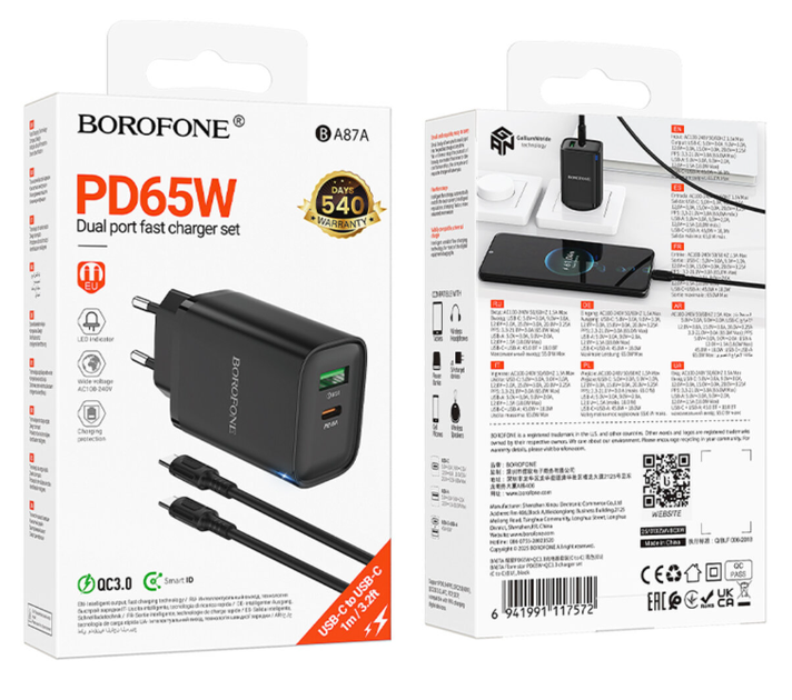 Мережевий зарядний пристрій з кабелем BOROFONE BA87A Flare star PD65W+QC3.0 charger set(C to C) Black new