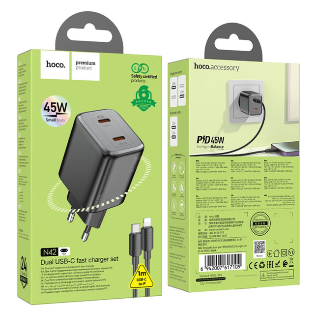 Мережевий зарядний пристрій з кабелем HOCO N42 Elogiado dual-port PD45W(2C) charger set(C to iP) Black new