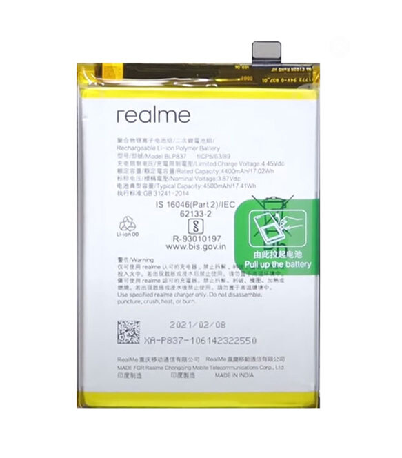 Realme BLP837 аккумулятор оригінал для Realme 8 Pro Характеристики: Емкость: 4500 мАч Напряжение: 3.85 В Тип: Литий-ионный Совместимость: Realme 8 Pro Преимущества: 100% оригинальный аккумулятор, гарантирующий надежную работу смартфона Большая емкость обеспечивает долгое время работы без подзарядки Идеально подходит для замены старого или поврежденного аккумулятора Производитель гарантирует высокое качество и безопасность использования
