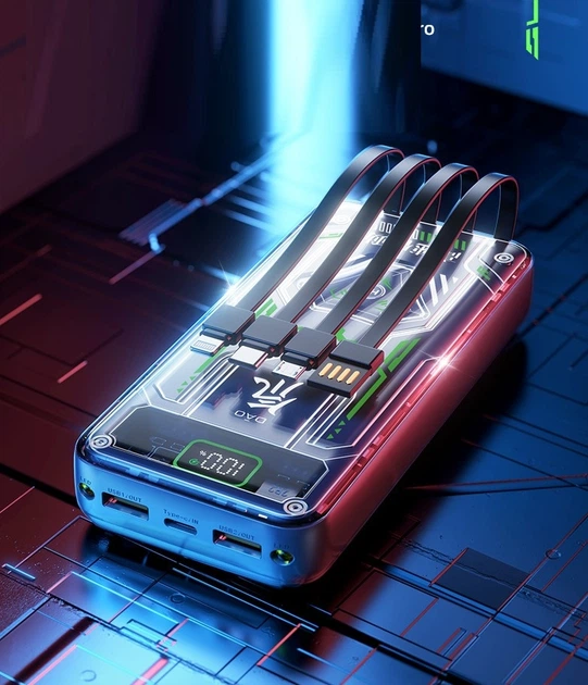 Повербанк з швидкою зарядкою 20000 mAh, з вбудованими чотирма кабелями. Чорний, (M1-03780)
