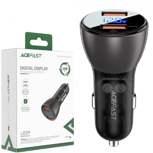 Зарядний пристрій ACEFAST 2хUSB 45W QC Metal Digital Display Black (DISPLAY CAR CHARGERB7)