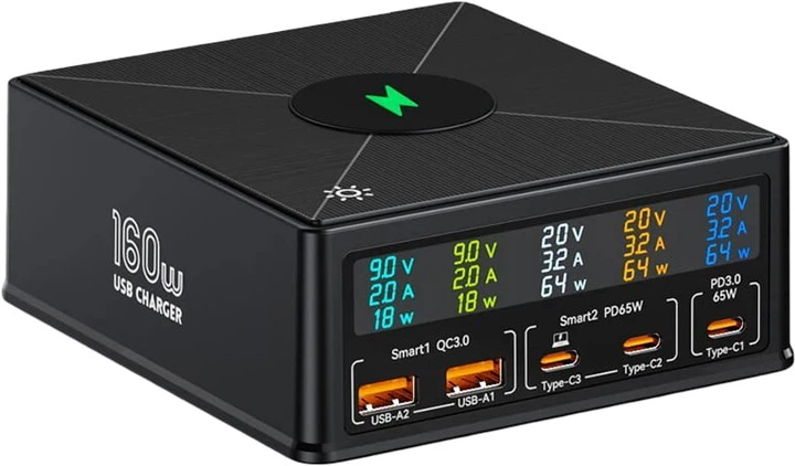Настільний зарядний пристрій ASOMETECH 868H 160W (PPS PD3.0 QC3.0) 2USB+3TypeC+Wireless+LED Black (43049)