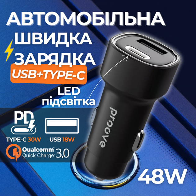 Автомобільний Зарядний Пристрій (Type-C + USB) 48W з Швидкою Зарядкою Proove Flash Зарядка в Прикурювач для Телефону з Підсв