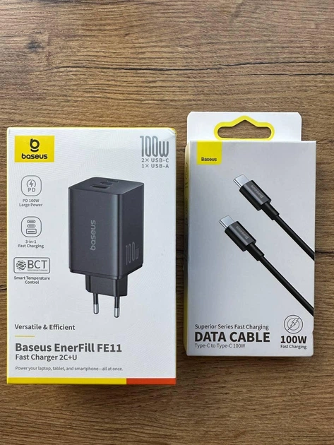 Мережевий зарядний пристрій Baseus Enerfill FE11 100W GAN (2 Type-C + 1 USB-A) + кабель 100W
