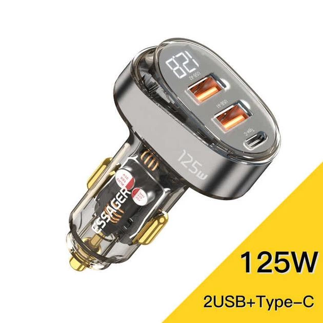 Швидкий автомобільний зарядний пристрій Essager сумарно 125W три порти 2USB+Type-C з цифровим дисплеєм та прозорим корпусом