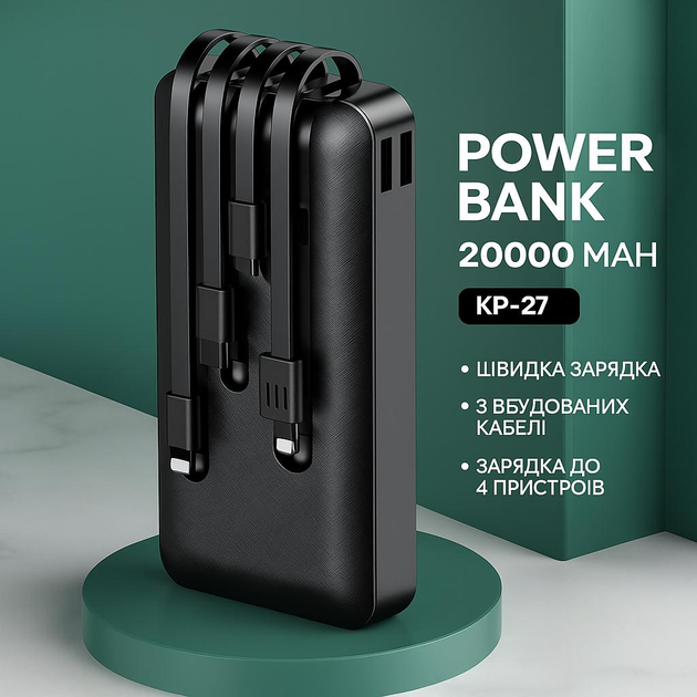 Power Bank KP-27 20000 mAh з двома USB, Type-C і micro-USB портами, швидкою зарядкою 2.1A, чорний корпус, універсальні перех