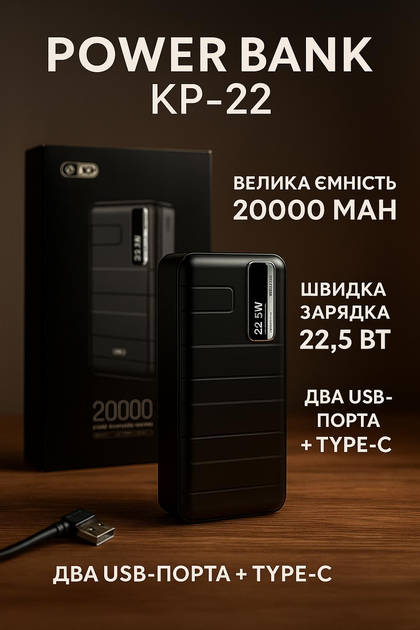 Power Bank KP-22 20000 mAh з Type-C і 2 USB виходами, швидка зарядка 22.5W, індикатор заряду, чорний корпус