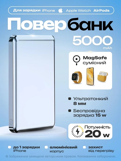 Магнітний повербанк 5000 mah 20W Qinetiq P5 aluminium powerbank magsafe 3 в 1 для епл apple айфона iphone 12 13 14 15 16 17