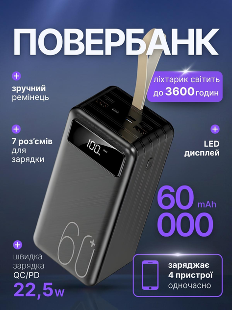 Повербанк 60000 mah 22.5W Qinetiq RQ-60 з LED дисплеєм і швидкою зарядкою PD/QC 5 портов кабель Type-C в комплекте powerbank