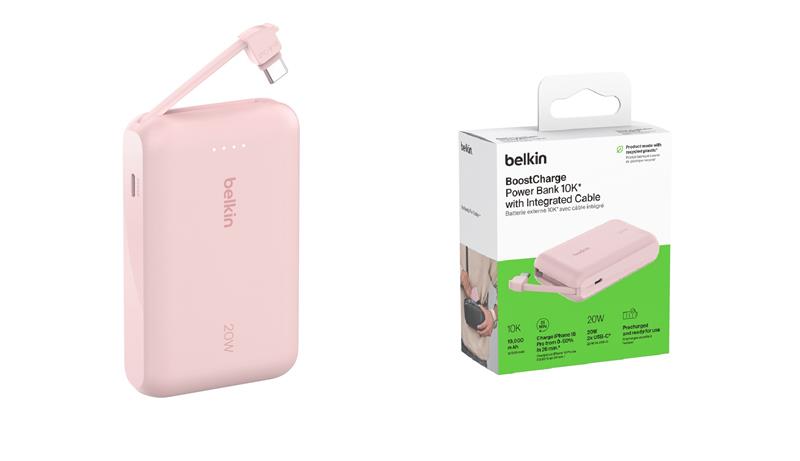 Акумулятор портативний літій-іонний Power Bank Belkin 10000мА·год, 20Вт, з інтегрованим кабелем USB-C, рожевий BPB021HQPK