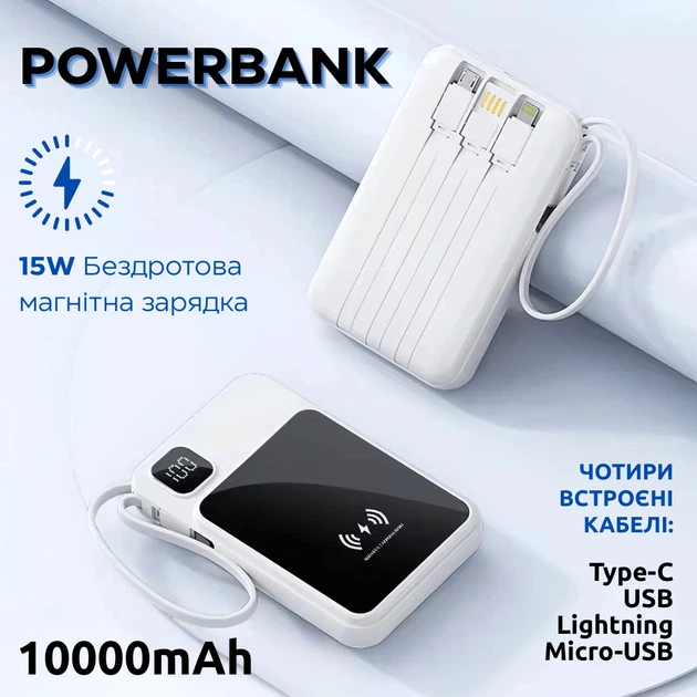 Павербанк бездротовий магнітний 10000мАч Powerbank зі швидкою зарядкою, 4 вбудованими кабелями, білий 5071244