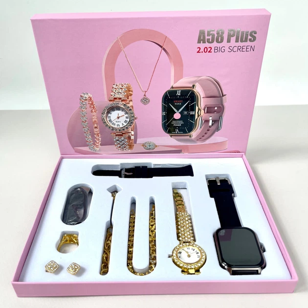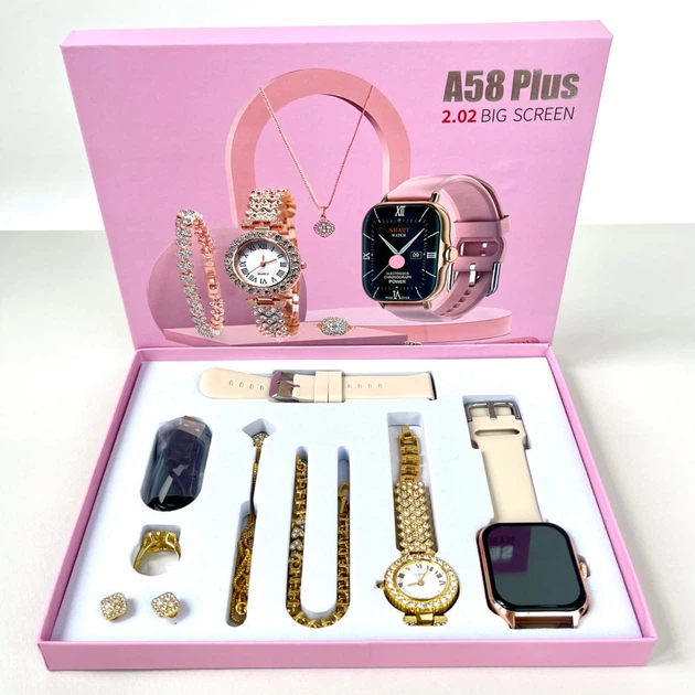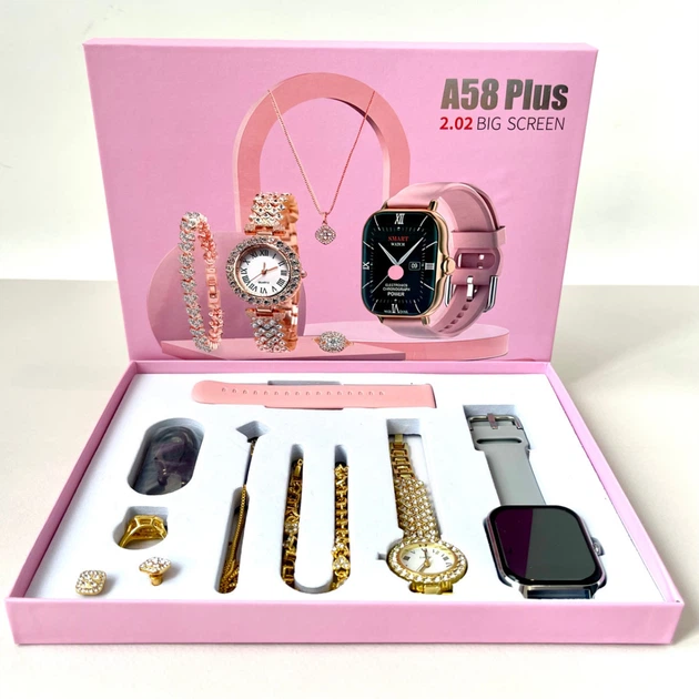 Набір комплект Megabox 6в1: Smart Watch 9, навушники Air Pro 2, павербанк, блок живлення рожевий