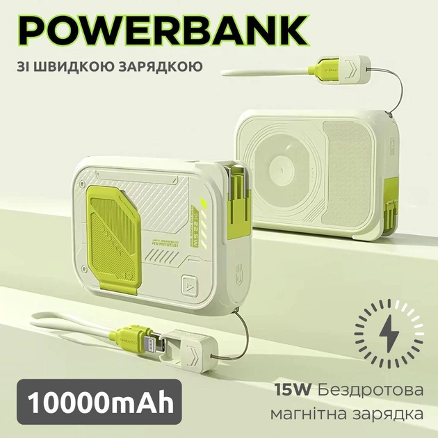 Павербанк з магнітною бездротовою зарядкою 10000мАг, Powerbank зі швидкою зарядкою і відкидною підставкою Powerbank10Green