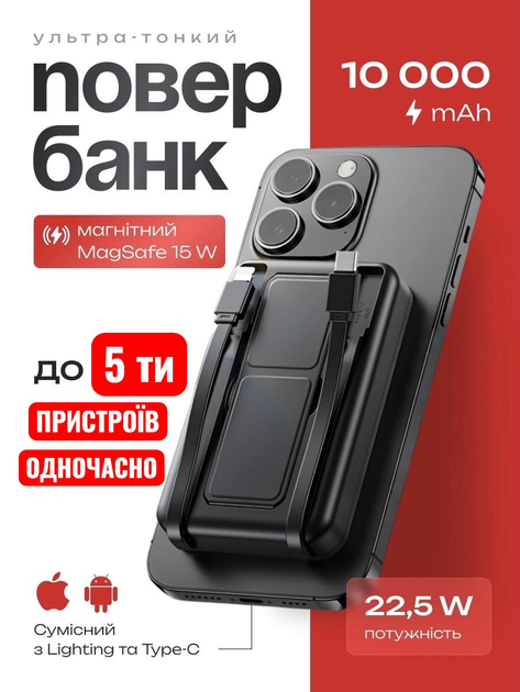 Павербанк УМБ бездротова магнітна швидка зарядка 3.0 PD Navu міні powerbank 15 Вт вбудований кабель USB Type-C Lightning 100
