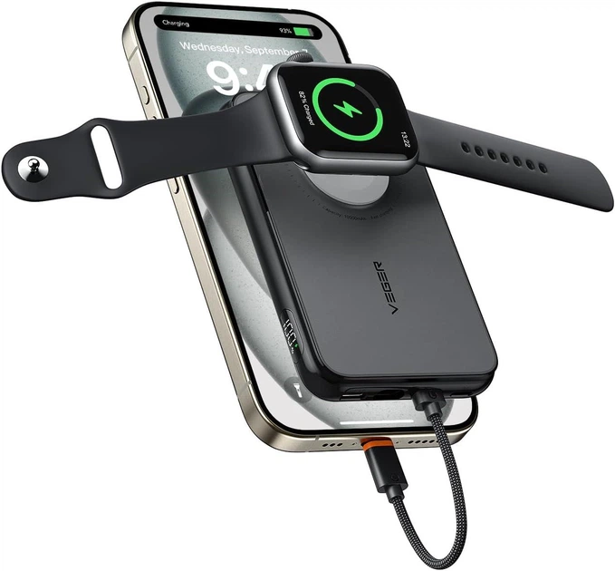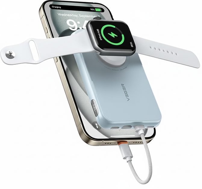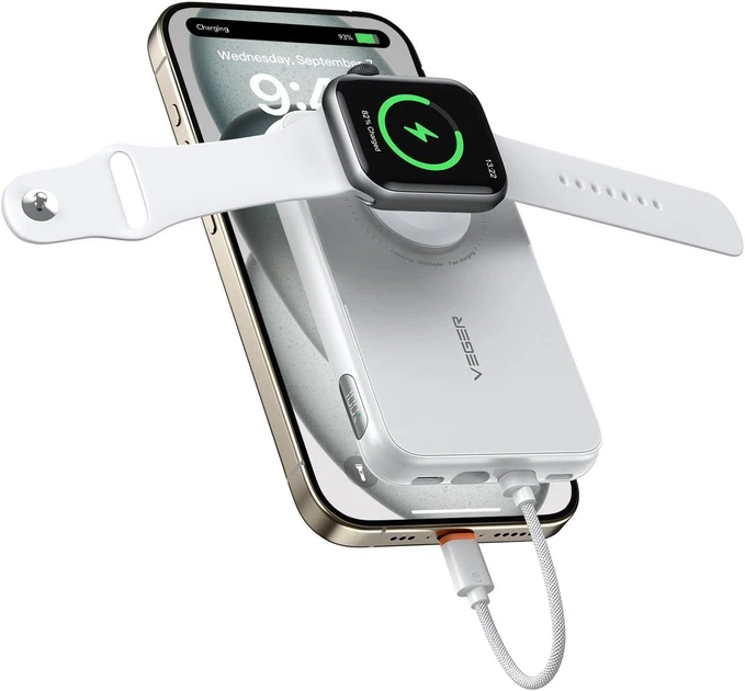 Ультракомпактний павербанк VEGER V1171 10000 мАг – з кабелем та бездротовою зарядкою для Apple Watch