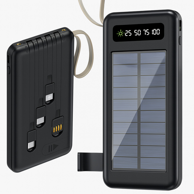 Power Bank із сонячною панеллю 10000мАч чорний портативний зарядний пристрій із 4 перехідниками для гаджетів