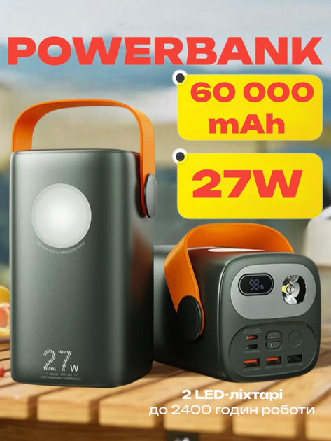Повербанк O2 Project 60000 mAh 30 wat для ноутбука, телефону. Зарядна станція на 6 портів USB Powerbank з ліхтариком (Black)
