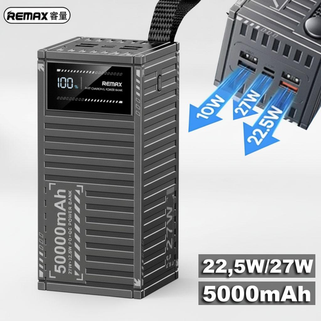 Power Bank зі швидкою зарядкою батареї 22.5W REMAX 50000 mAh, Потужний повербанк з ремінцем для перенесення 956409 Black