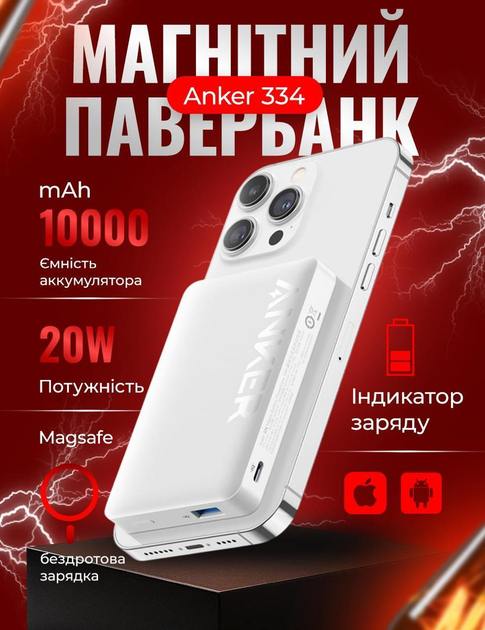 Павербанк Anker 334 MagGo 10000 mAh з бездротовою, магнітною зарядкою Magsafe для iPhone Білий