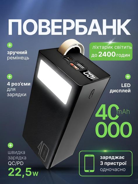 Повербанк 40000 mah 22.5W Qinetiq Phoenix RQ-40 з LED дисплеєм і швидкою зарядкою PD/QC 3 порта кабель Type-C в комплекте po