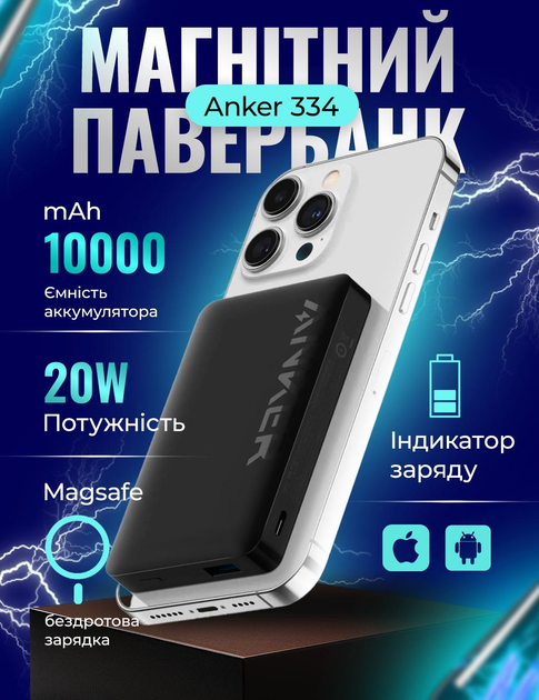 Павербанк Anker 334 MagGo A1642 10000 mAh з бездротовою, магнітною зарядкою Magsafe для iPhone
