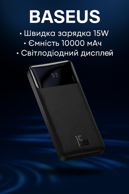 Power Bank Baseus 10000 mAh с 3 портами USB и Type-C, быстрой зарядкой 15W, компактным корпусом, чёрный цвет
