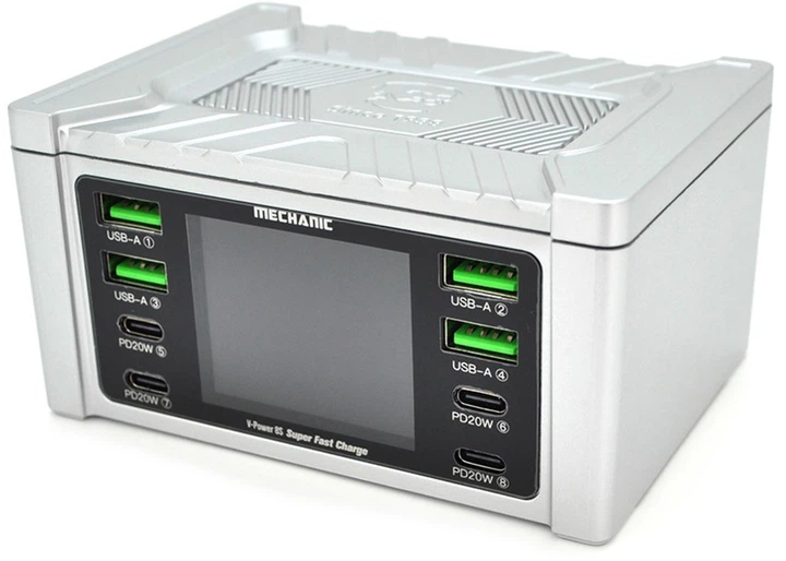 Зарядна станція з цифровою індикацією Mechanic V-Power 8S, 4xQC3.0-, 4xPD3.1-5В3А, 9В2.22A, 12В1.67А. 220V/115W, 114x60x84 м