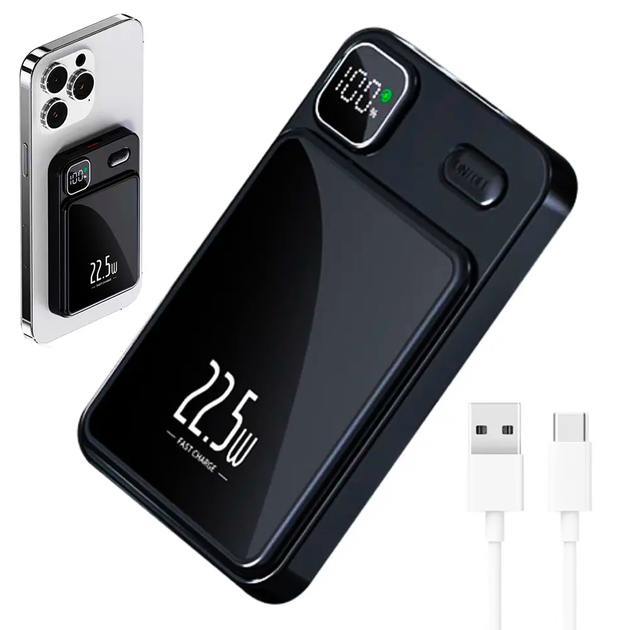 Повербанк на 10000 mAh з бездротовою зарядкою, 22,5W, Type-c, MagSafe, Чорний / Магнітний powerbank (L)