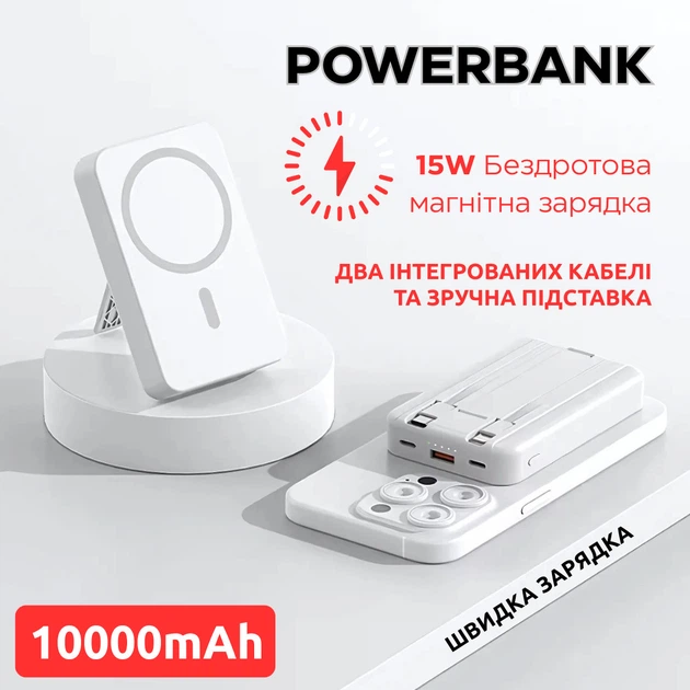 Павербанк бездротовий магнітний 10000мАг Powerbank зі швидкою зарядкою та 4 вбудованими кабелями, білий