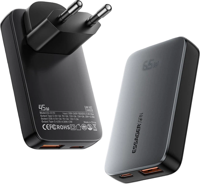 Зарядний пристрій ESSAGER ES-CD43 65W GAN (PPS, PD3.0, QC4.0) порти USB + TypeC Black (43035)