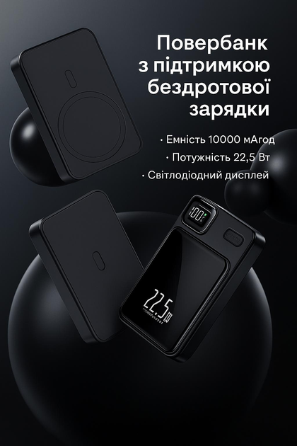 Power Bank 10000 мА·год з бездротовою зарядкою 22.5W, MagSafe, QC 3.0, Type-C, швидка зарядка, чорний