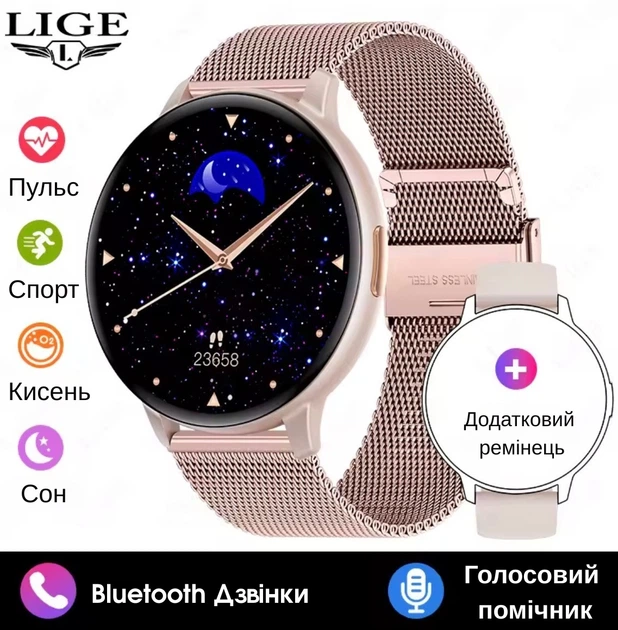 Смарт-годинник жіночий Lige T6 Pink (розмова, пульсоксиметр) 2 ремінці