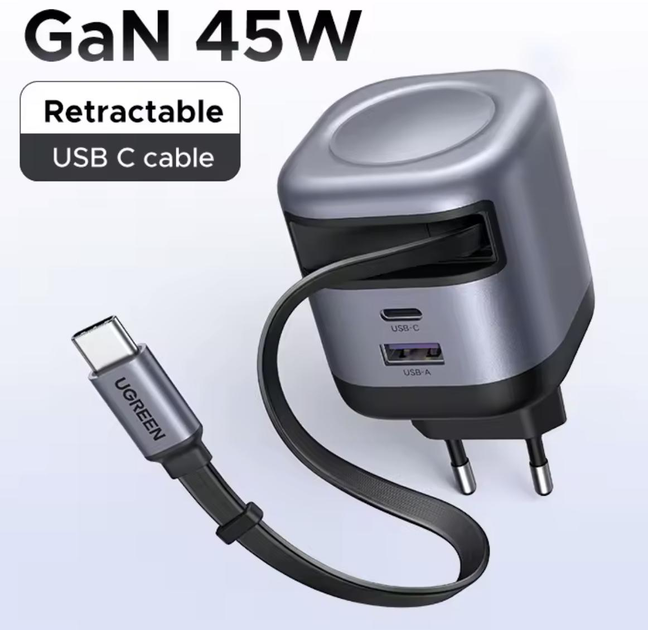 Зарядний пристрій UGREEN 45W GaN Fast Charger з висувним кабелем UFCS PPS QC PD 3.0