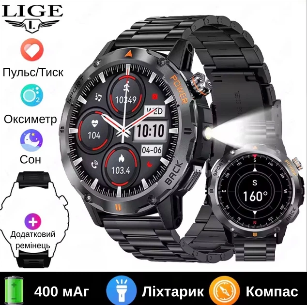 Смарт годинник чоловічий Lige YK06 Black (дзвінки, пульсоксиметр, тонометр, компас) 2 ремінці